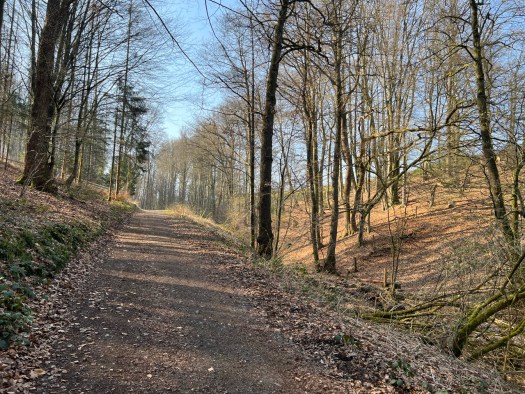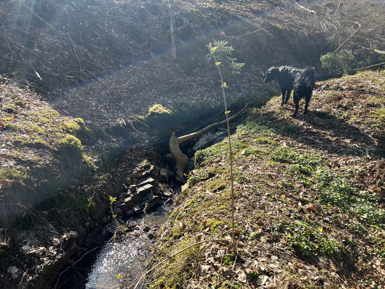 Die normale Runde durch den Wald dauert etwa 45 Minuten, wenn einem kein anderer Hund an der Leine entgegenkommt, kann der Hund die gesamte Strecke ohne Leine laufen, er jagt ja auch nicht, sonst wäre das nicht so einfach. Es ist also zumindest in der Hinsicht alles genauso eingetroffen, wie wir es uns erhofft haben. Zusätzlich ist der Wald auch noch sehr hübsch waldig und vor sich hin gluckernde Bächlein sind ja sowieso schön. Der Hund findet den Bach auch gut zum Trinken, achtet aber nach wie vor sehr darauf, sich nicht die Pfoten nass zu machen.
