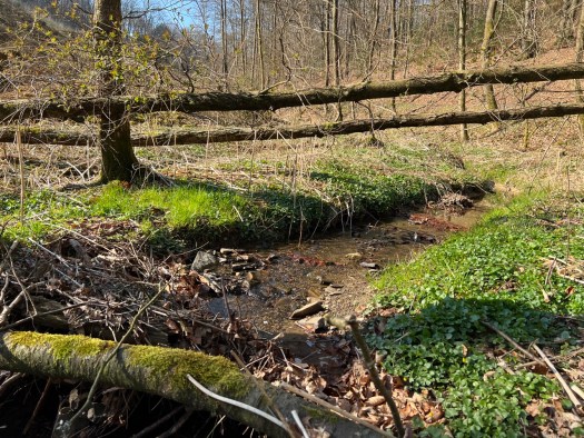 Wenn ich aus dem Arbeitszimmerfenster gucke, sehe ich vor allem das Nachbarhaus, aber auch Wald und zwar der Wald, in dem wir jetzt ein oder zwei Mal am Tag Waldbaden. Wir hatten das ja vorher nicht umfassend ausgetestet, der Plan war, dass wir in Zukunft nur noch kurze Strecken mit dem Hund an der Leine sind und dann irgendwo in der Natur sind, wo er ohne Leine laufen kann. Das ist hier der Fall. Man geht etwa 300 Meter die Straße runter, dann ist man auf einer Wiese, dann lässt man den Hund von der Leine und klettert einen Trampelpfad runter und dann steht man im Wald. Im Wald sind entweder ein oder mehrere Bäche, da bin ich mir noch nicht sicher, ob es einfach ein und derselbe ist, der immer wieder auftaucht oder ob das mehrere sind, die irgendwo zusammenfließen.